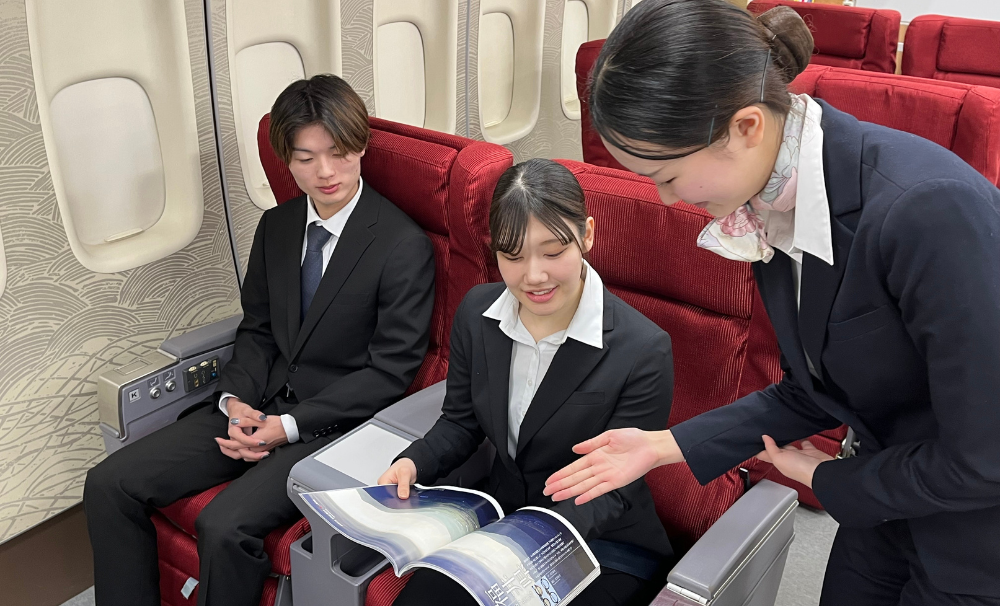 国際エアラインモデルでは、機内サービスやカウンター業務等の実践的な技能を習得するとともに、異文化理解、国際関係論などを学ぶことで、エアライン業界で必要な知識を身につけます。英語力やコミュニケーション力を高め、ロールプレイ実習もこなすことで対応力を養います。
