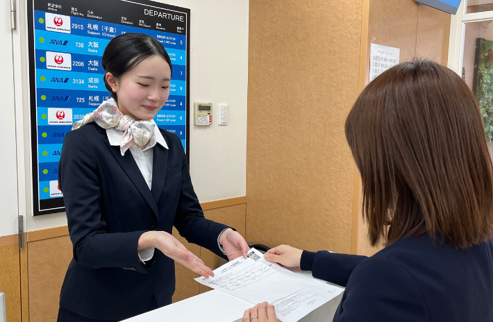- グランドスタッフ業務に必要な実務的なスキルを学びます。業界の専門用語や業務内容、接客の心構えも身につけます。空港カウンターを模した実習設備を使用し、チェックイン業務などのロールプレイ実習を行います。