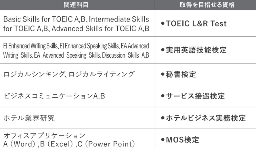 超有名ホテル就職実績多数の姉妹校ネットワークでホテルの知識だけでなく、語学やファシリテーションなどの科目を通して、ホテル業界で求められる英語力、接遇力を身につけます。